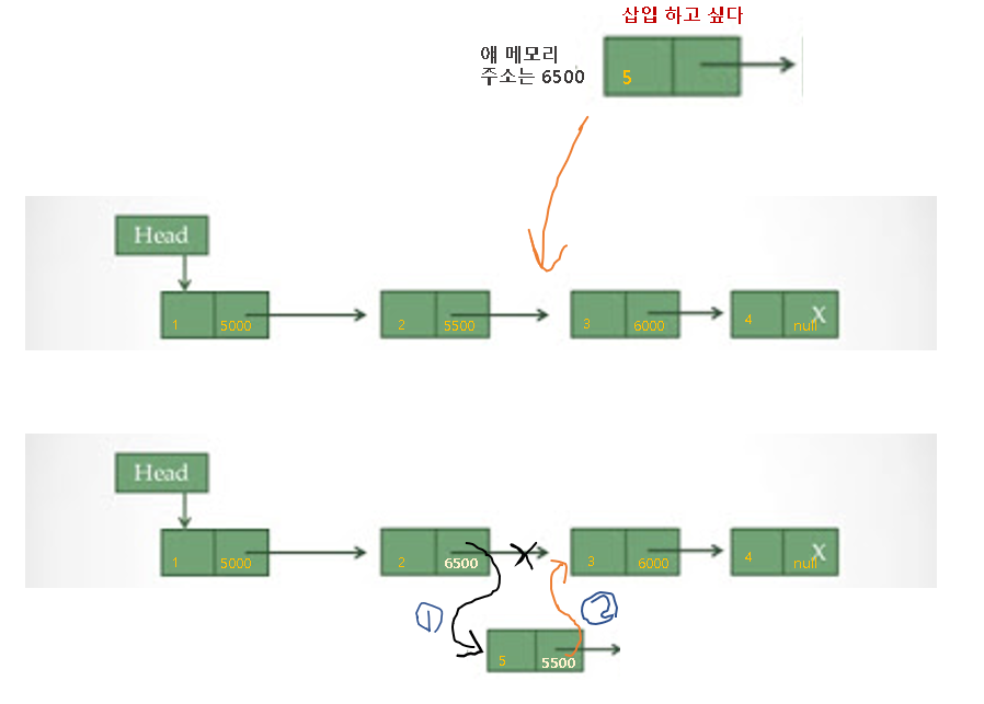 - 삽입될 노드의 선행 노드가 될 노드의 링크 필드가 삽입할 노드의 주소를 가리키게 한다.